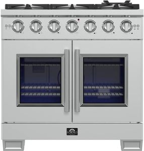 The 36” Forno Capriasca French Door Dual Fuel Range brings professional styling and Performance into your home kitchen with its durable stainless-steel design. Unique french doors mean open doors allow up to 12" of more space to access your oven. The gas rangetop has 6 sealed dual-ring brass burners with a total output of 120,000 BTU for simmering melting chocolate or sauces, The heavy-duty continuous cast iron grates allow maximum stability of cookware mobility over a recessed enamel Cooking Surface cavity which keeps spills and splashes contained and easy to clean. The 5.36 cu. ft. gas oven with a total output of 30,000 BTU is encased in a speckled blue enamel interior fitted with a convection fan, ensures to achieve fast, precision and consistent oven cooking along for easy viewing is a 3-layer glass oven door window. Included is an LP conversion kit, 3 stainless steel telescopic oven racks, wok-ring, reversible griddle, rotisserie kit and skewers forks, air fry basket with rack and drip pan. Additionally, zinc coated metal knobs with bezel rings will maintain their beauty for years.Read More