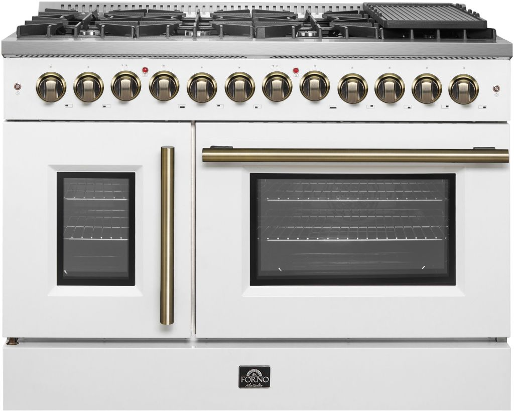 Our 48" Galiano Dual Fuel French Door Range blends timeless design and high performance. Featuring a crisp white finish and antique brass knobs, this range adds sophistication to any kitchen at an affordable price. The cooktop boasts eight sealed burners with a total output of 107,000 BTU, including a 20,000 BTU dual-ring burner ideal for boiling, searing, or simmering delicate sauces.Read More