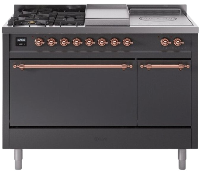 Introducing the new Nostalgie II 48" dual fuel range, a classic addition with a touch of innovation to any kitchen. This range feature sealed burners equipped with total black brass flame spreader that has a non-stick nanotechnological coating, heavy cast iron grates, 3.5 + 1.52 cu. ft. total double oven capacity and soft closing door system.Read More